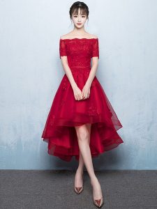 Red Lace High Low Prom Cocktail Party Dresses Color : Red Embellishment : Sash, Lace Fabric : Tulle, Satin Fabric Neckline : Off-the-Shoulder Occasion : Cocktail, Prom Read More March 7, 2019 No Comments