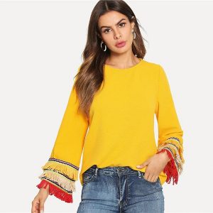 Embroidery Tape And Fringe Bell Sleeve Textured Blouse Color block Tiered Layer Women Autumn Flounce Sleeve Top Color : Yellow Size : XS, S, M, L Collar : O-Neck Sleeve Type : Flounce Sleeve, Layered Sleeve Material : Polyester, Spandex Read More October 7, 2018 No Comments