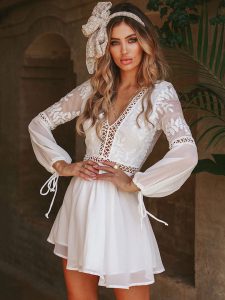 Backless Cut Out Organza V Neck Long Sleeves Mini Dress Color : White Fabric : Polyester Pattern : Solid Color Style : Chic & Modern Season : Summer , Fall Read More August 31, 2019 No Comments