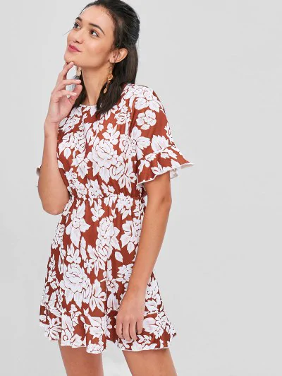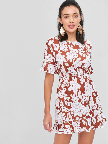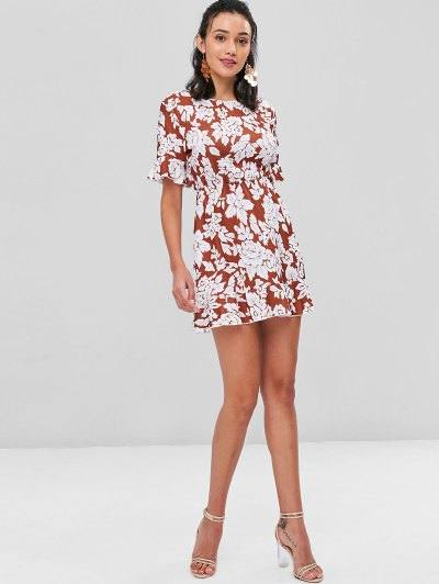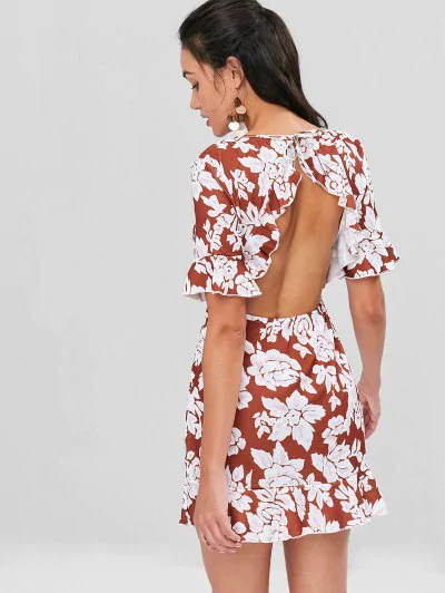 Decorated with high-contrast floral print, this sweet tea dress gets additional feminine flair thanks to its flirty cutout back trimmed with flirty ruffles and fastened with a bow tie. Wear with flats to complete the look.