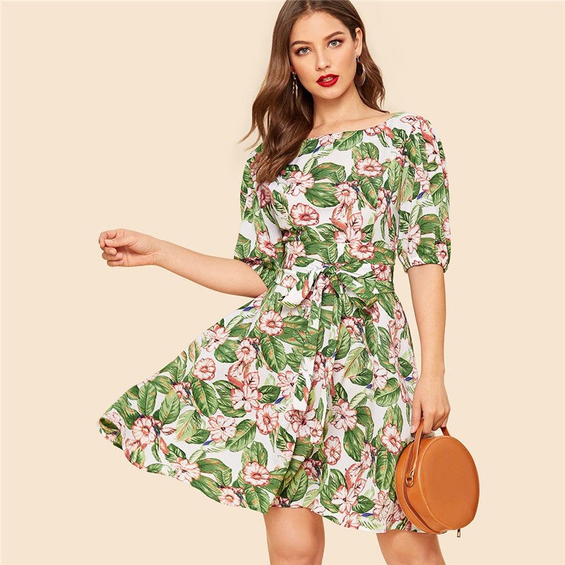 Multicolor Floral Print Belted Mini Puff Sleeve Casual A Line Dress