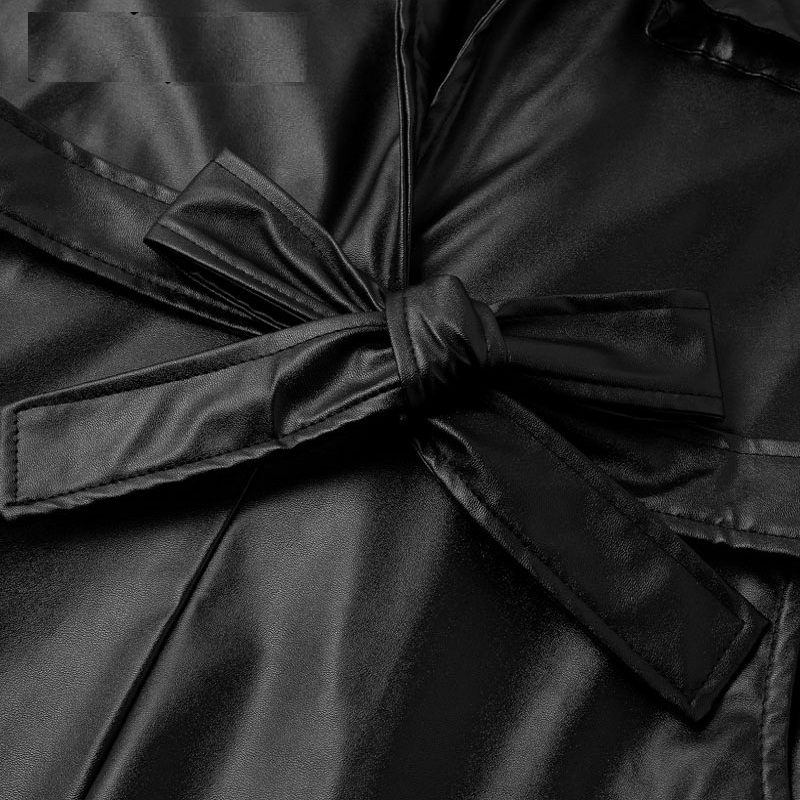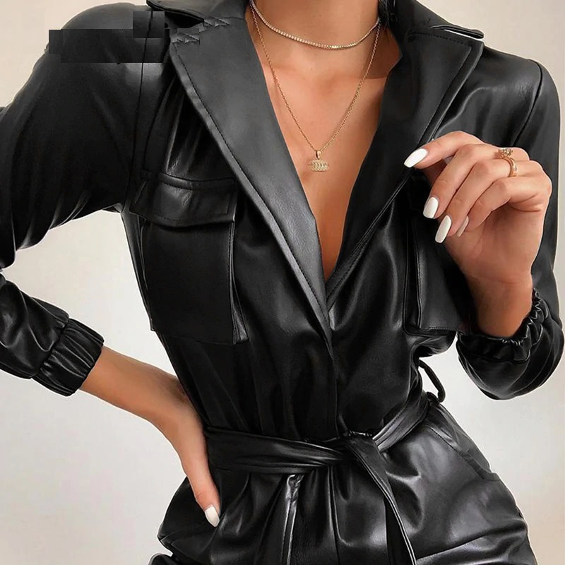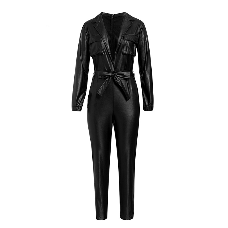 Streetwear V Neck Sexy Faux Leather Sash Belt Jumpsuit