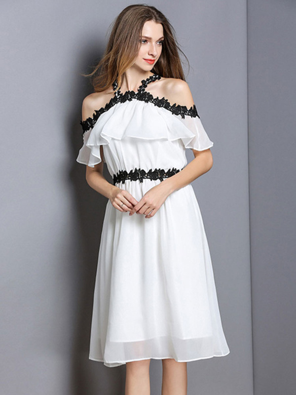 White Skater Dress Chiffon Short Sleeve Lace Summer Dress For Women