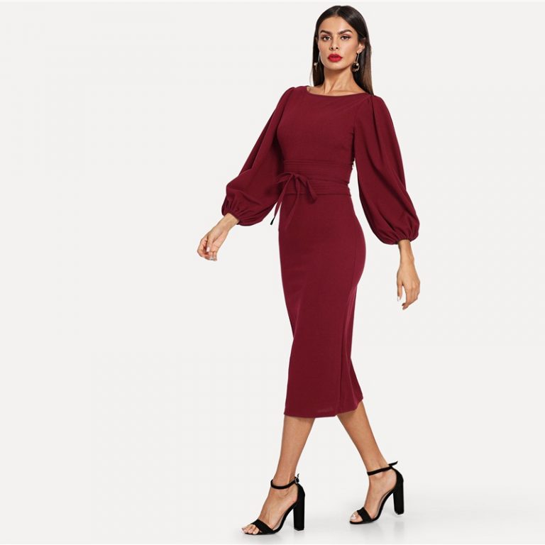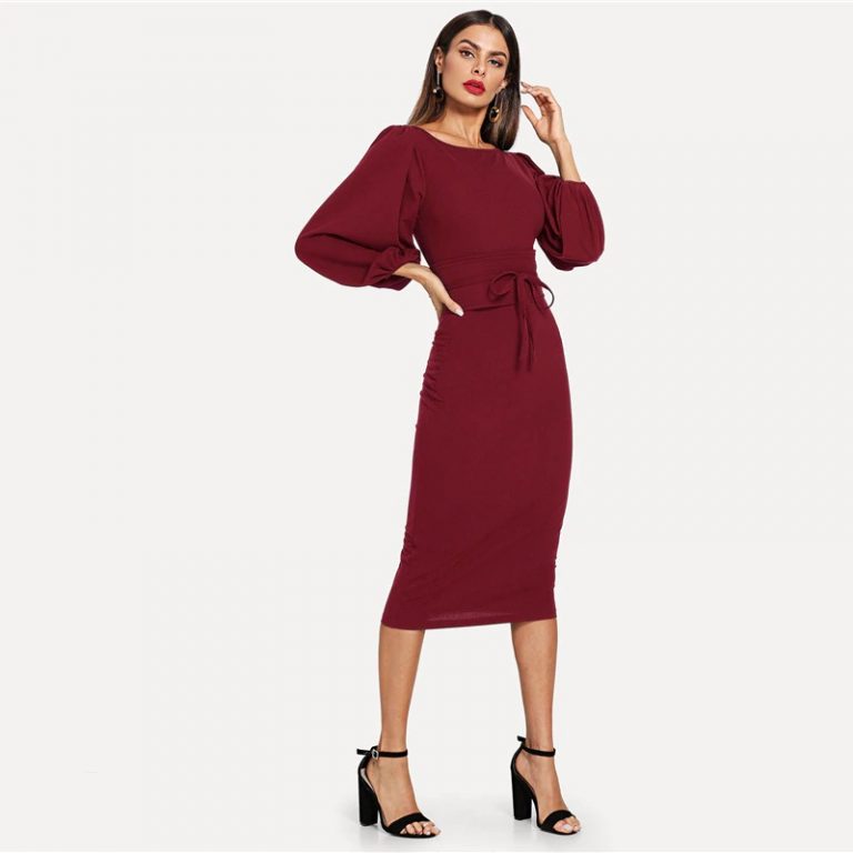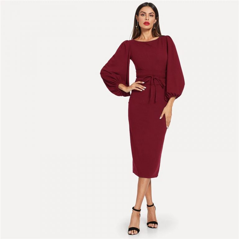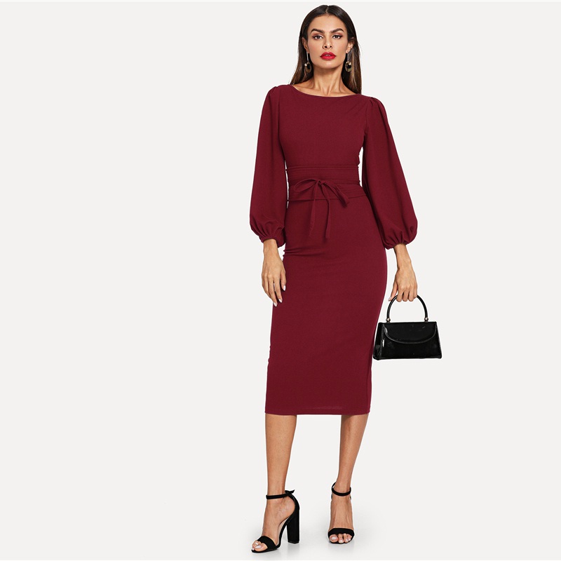 Women Tie Waist Long Lantern Sleeve Streetwear Dress
